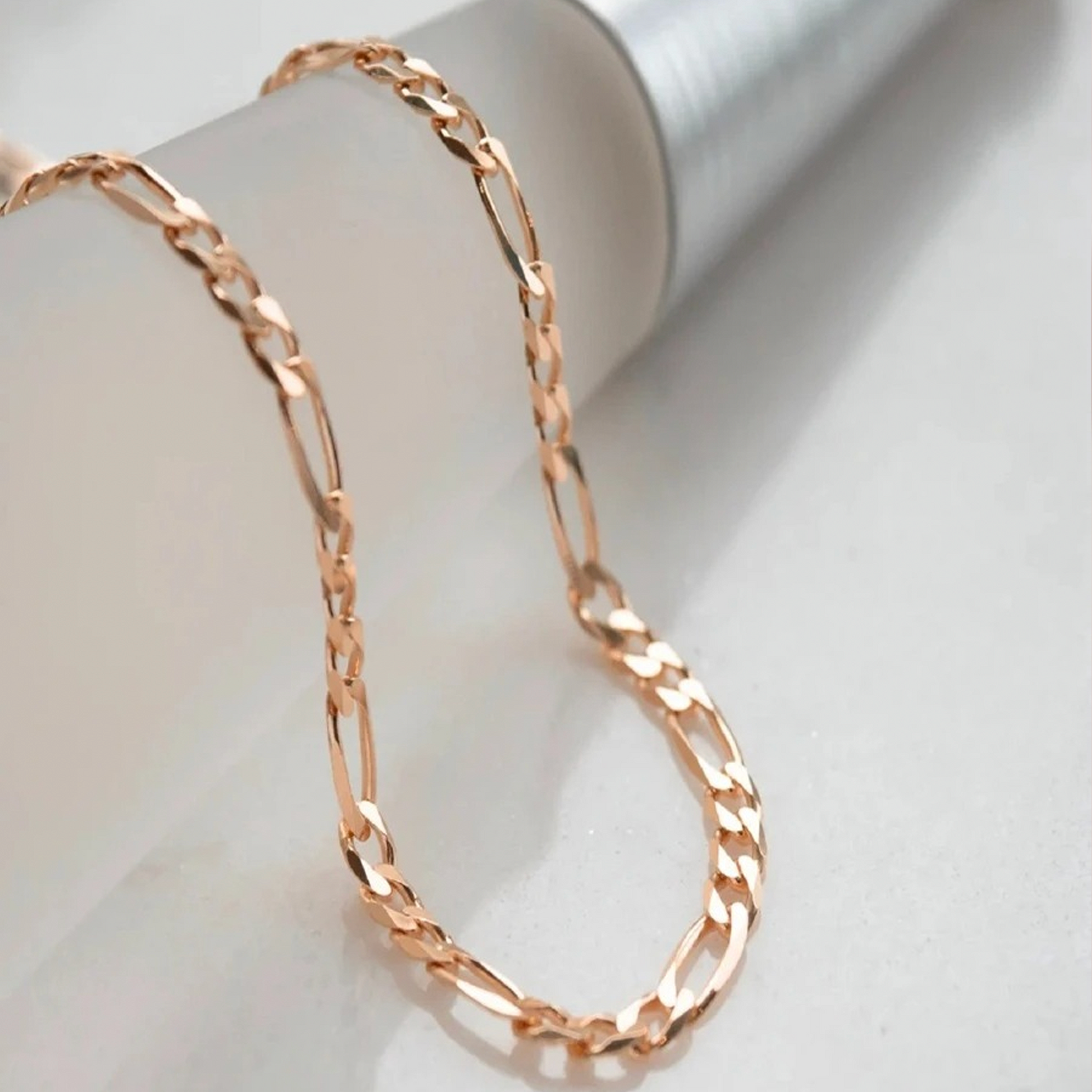 Un clásico renovado con un toque de sofisticación y delicadeza. Esta hermosa cadena Fígaro en oro rosa laminado 14K es el accesorio ideal para realzar cualquier look con elegancia y estilo atemporal.