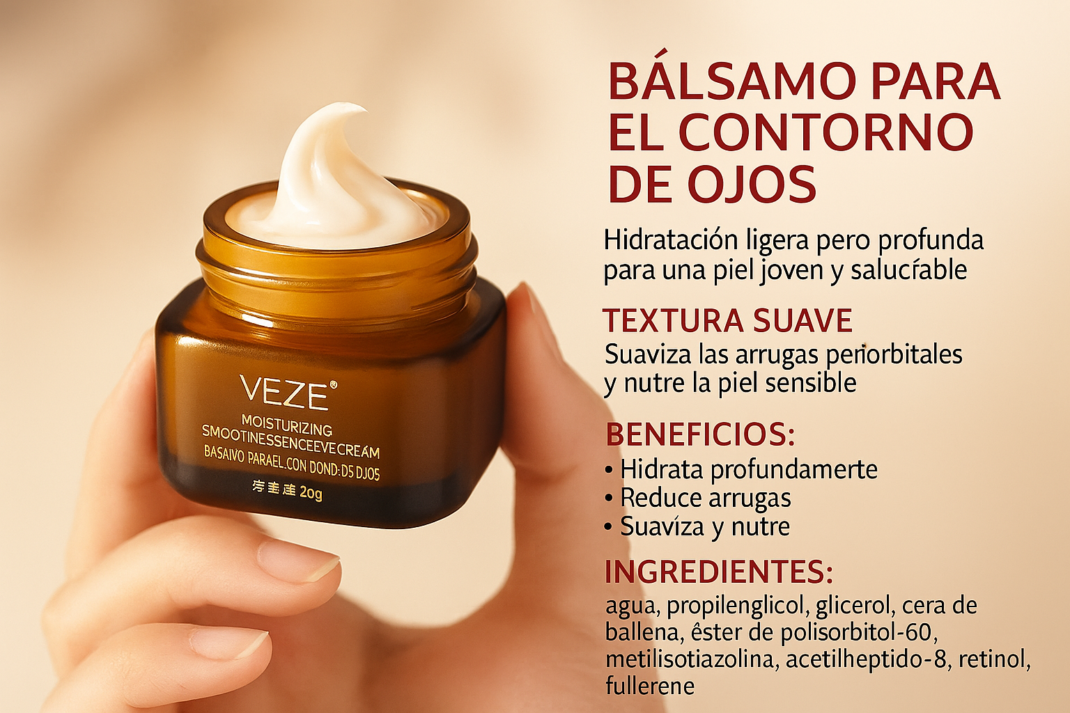 Crema de ojos Hidratante VEZE tiene una textura ligera y suave que se absorbe fácilmente, ideal para cuidar la piel delicada que rodea los ojos. Su fórmula está pensada para aportar una sensación de hidratación, mejorar el aspecto de la sequedad y mantener la piel con una apariencia más descansada. Contiene ingredientes humectantes y emolientes como hialuronato de sodio, alantoína y retinol, conocidos por su uso en productos para el cuidado de la piel.